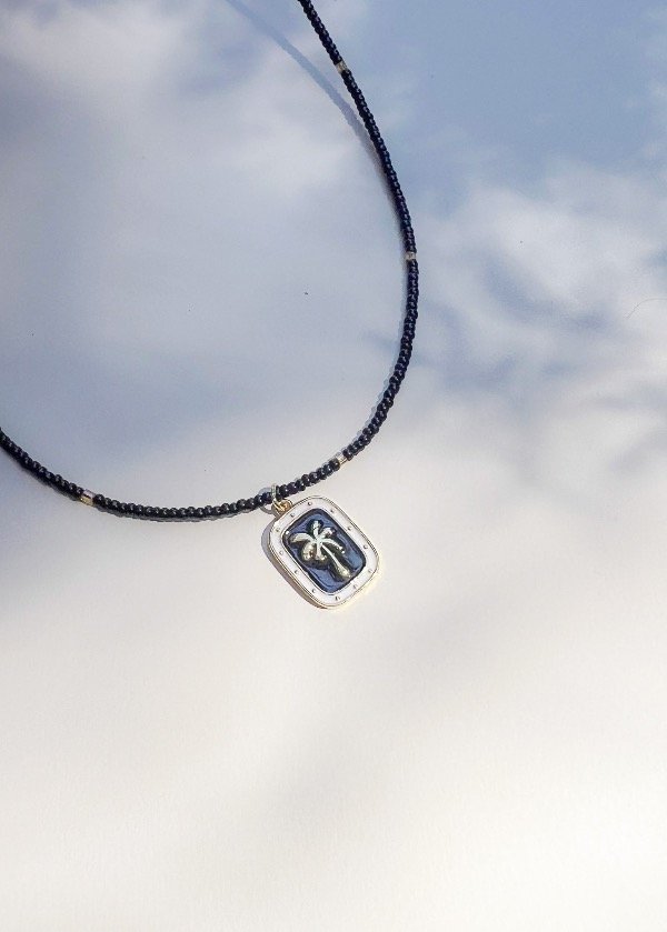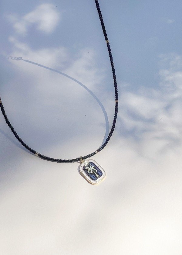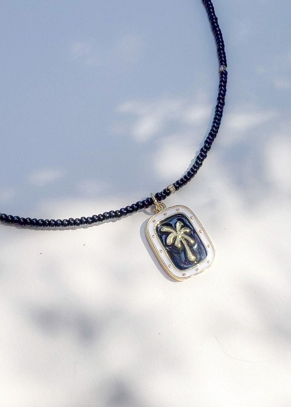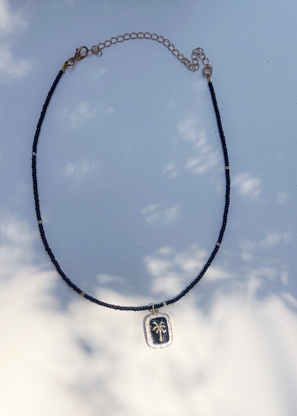 Collar de piedra onix pulida color negro + Dije Palmera. Viene con 10cm de alargue