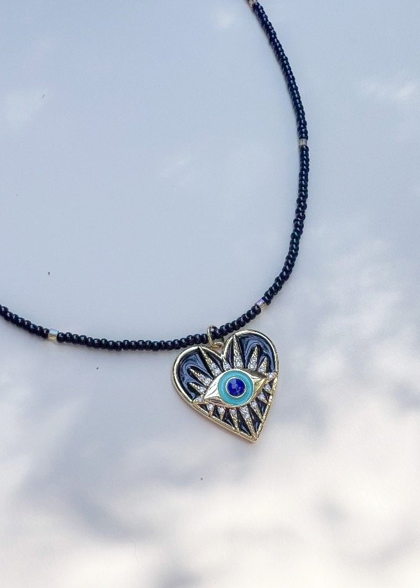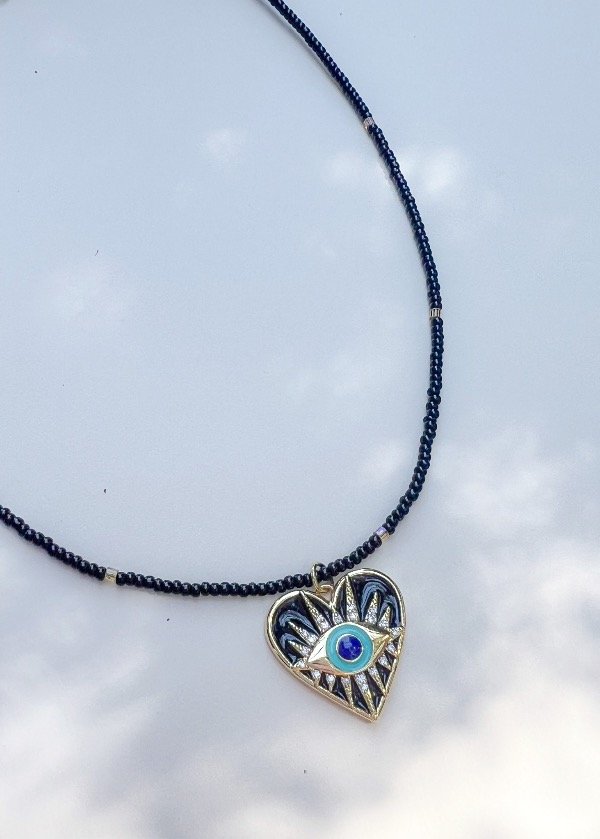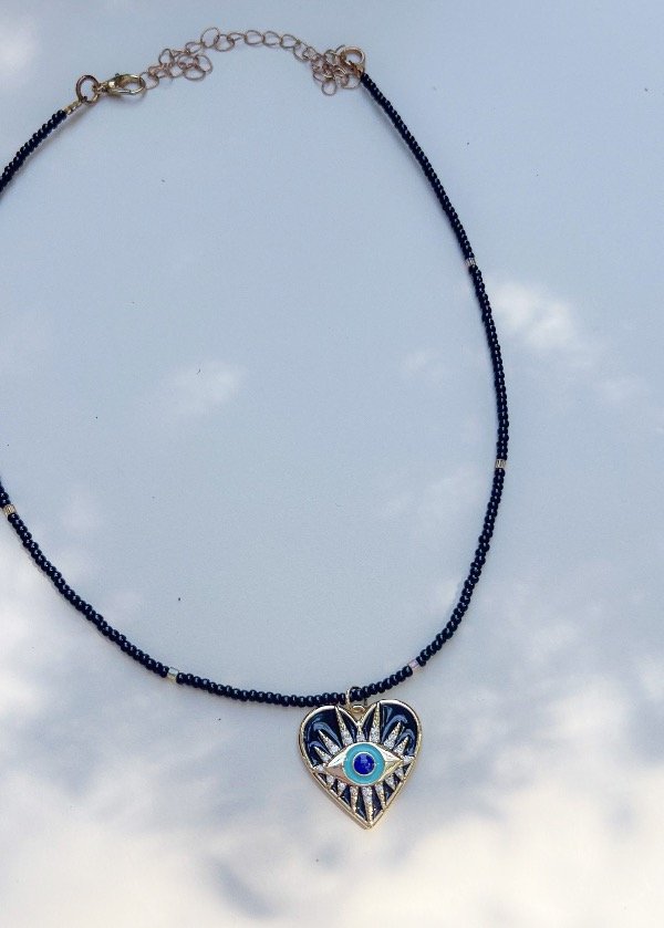Collar de piedra onix pulida color negro + Dije Corazón. Viene con 10cm de alargue