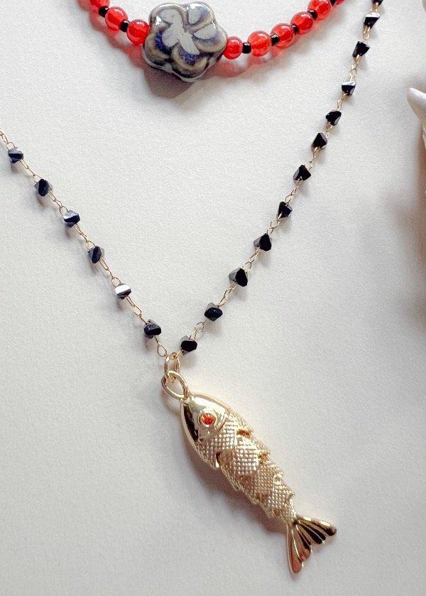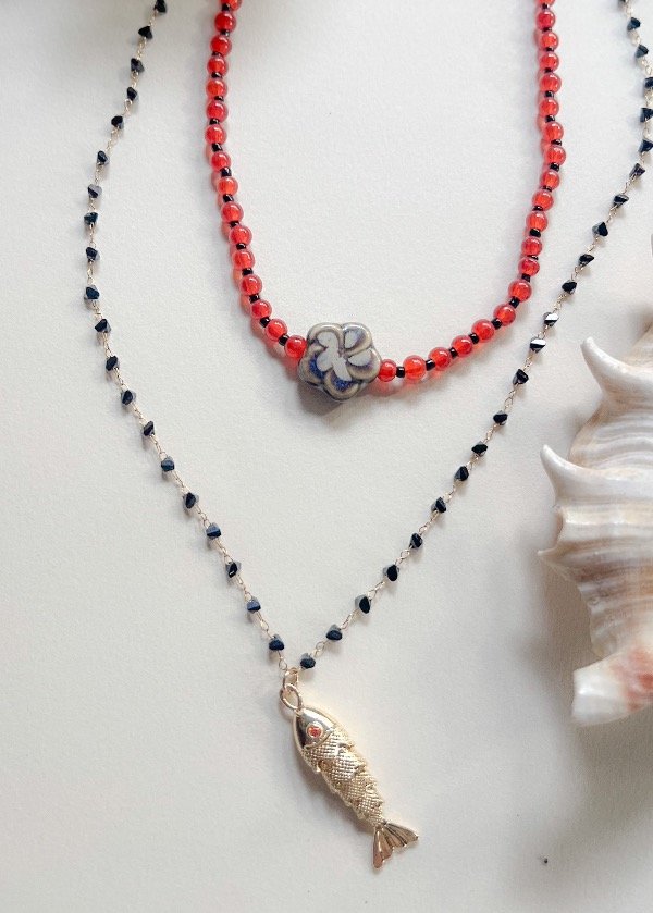 Incluye dos piezas: un collar Flor + un collar de cadena con piedras con dije pez