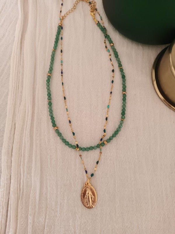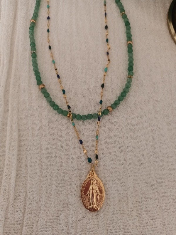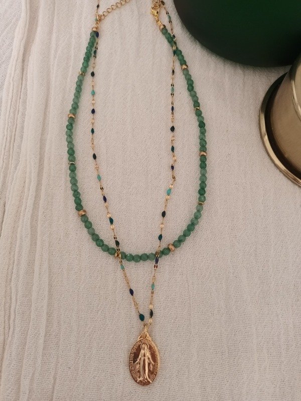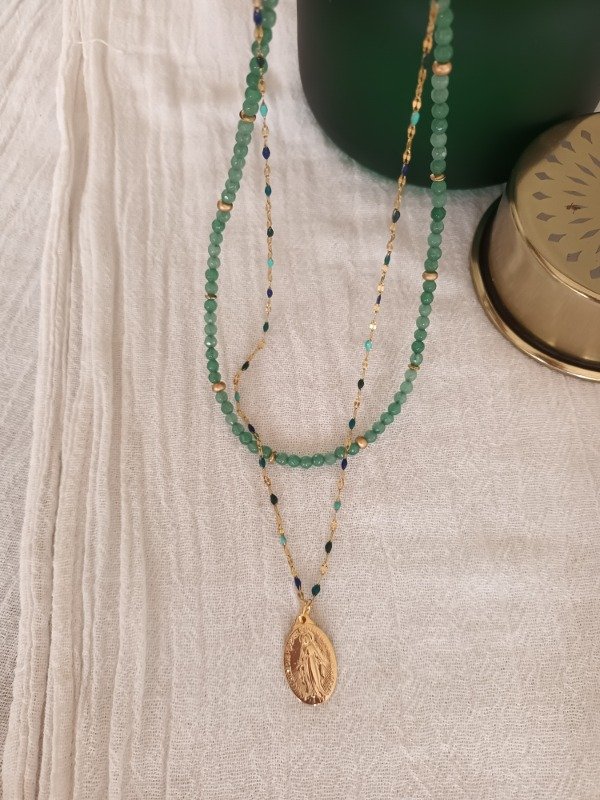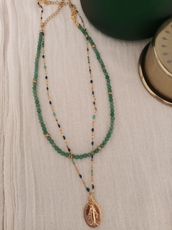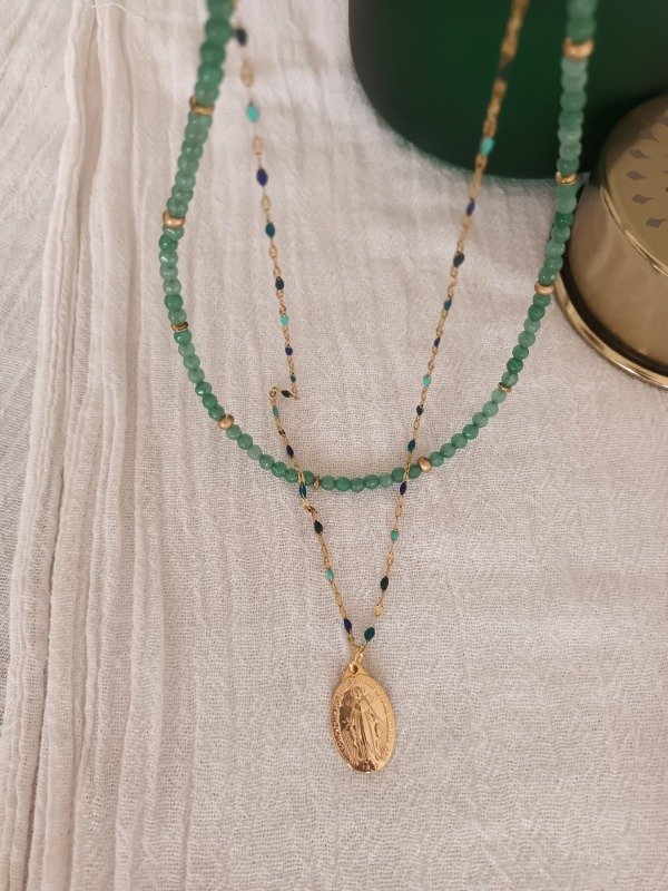 Incluye dos piezas, un collar de piedra ágata verde + 1 medalla Milagrosa bañada en oro con cadena salamanca mix de verdes