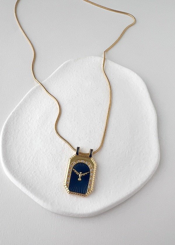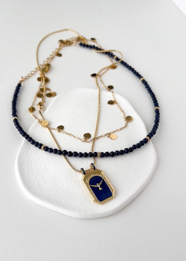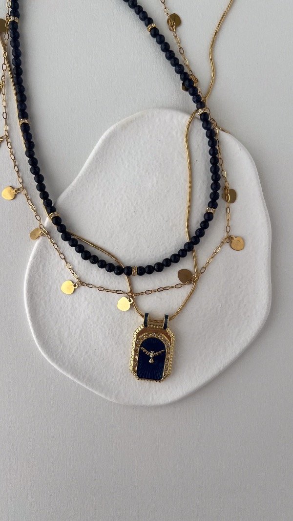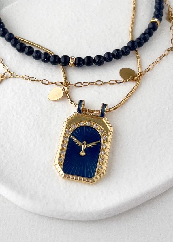 Incluye tres piezas: un collar agata azul oscuro + una cadena toledo bañada en oro + dije sagrado Espíritu Santo. Las tres piezas se puede usar juntas o cada una por separado, no están atadas entre sí.
