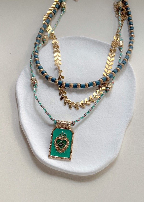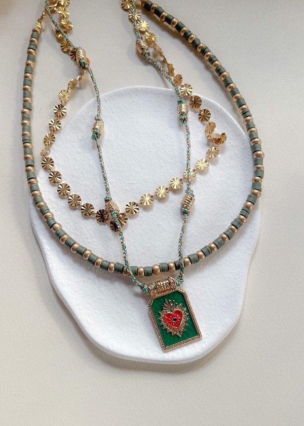 Incluye tres piezas: un collar maika verde + una cadena bañada en oro + dije sagrado corazón verde con cordón. Las tres piezas se puede usar juntas o cada una por separado, no están atadas entre sí.