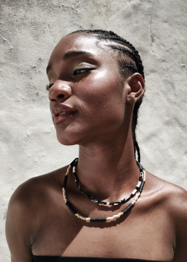 Collar hecho de fimo beige y negro. El collar mide 35cm + 10cm de alargue