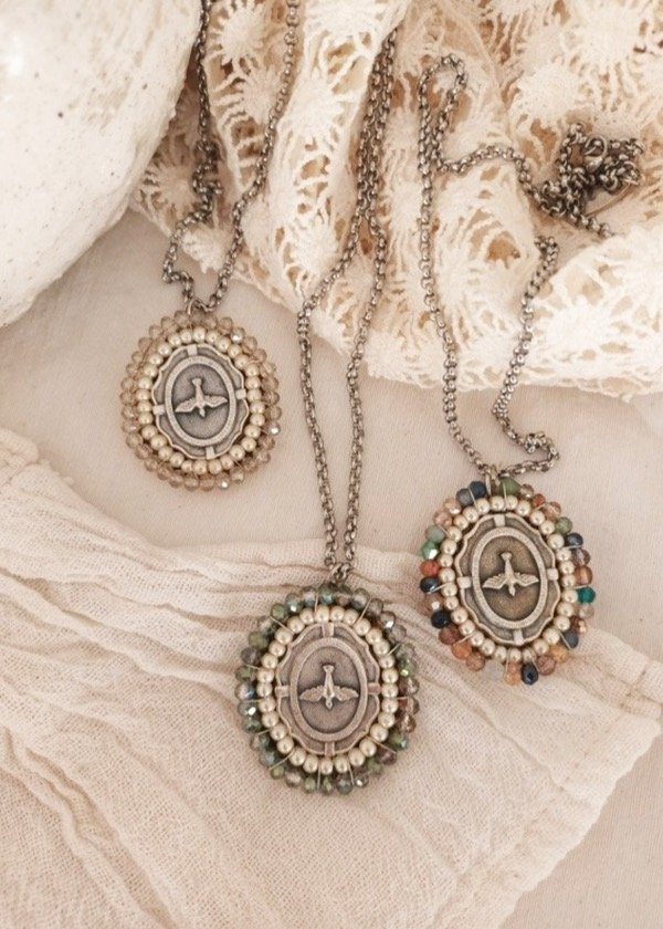 Medalla de zamac, cosida con perlas de río y vidrios checos. Viene con la cadena de acero quirúrgico incluída.