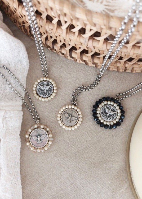 Medalla de zamac, cosida con perlas de río y vidrios checos. Viene con la cadena de acero quirúrgico incluída.