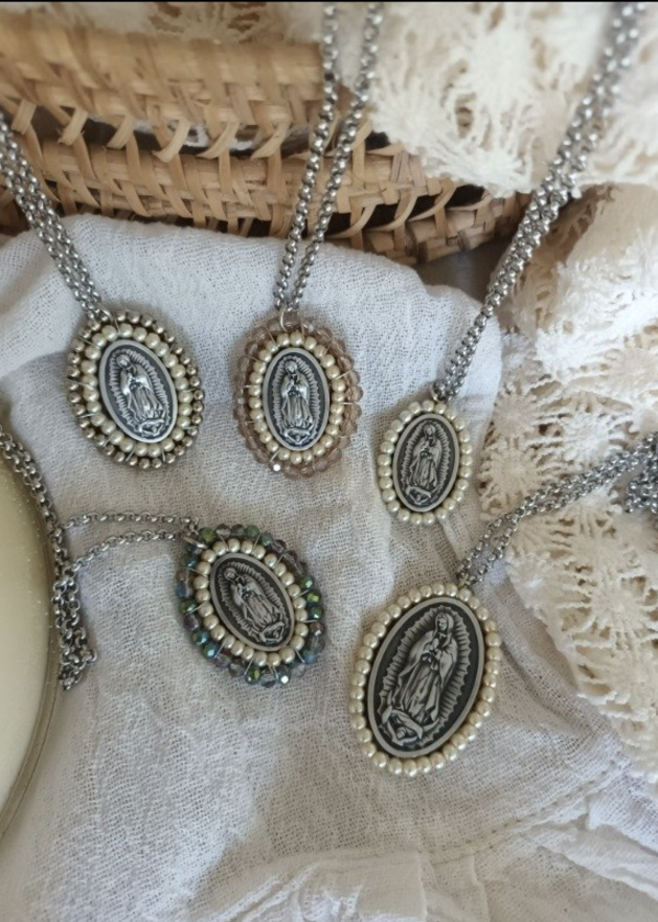 Medalla de aluminio, cosida con perlas de río y vidrios checos. Viene con la cadena de acero quirúrgico incluída.