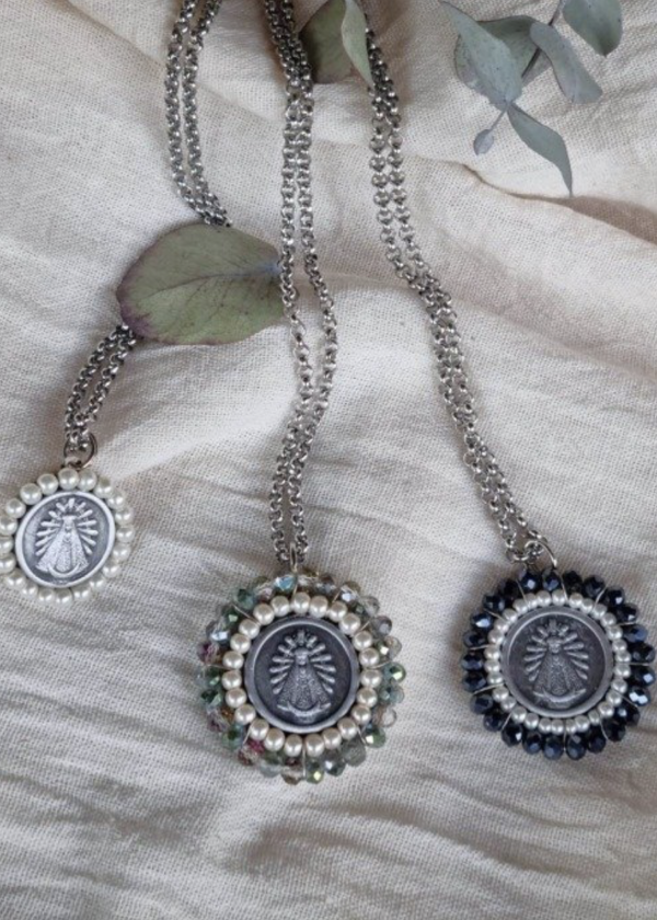 Medalla de aluminio, cosida con perlas de río y vidrios checos. Viene con la cadena de acero quirúrgico incluída.