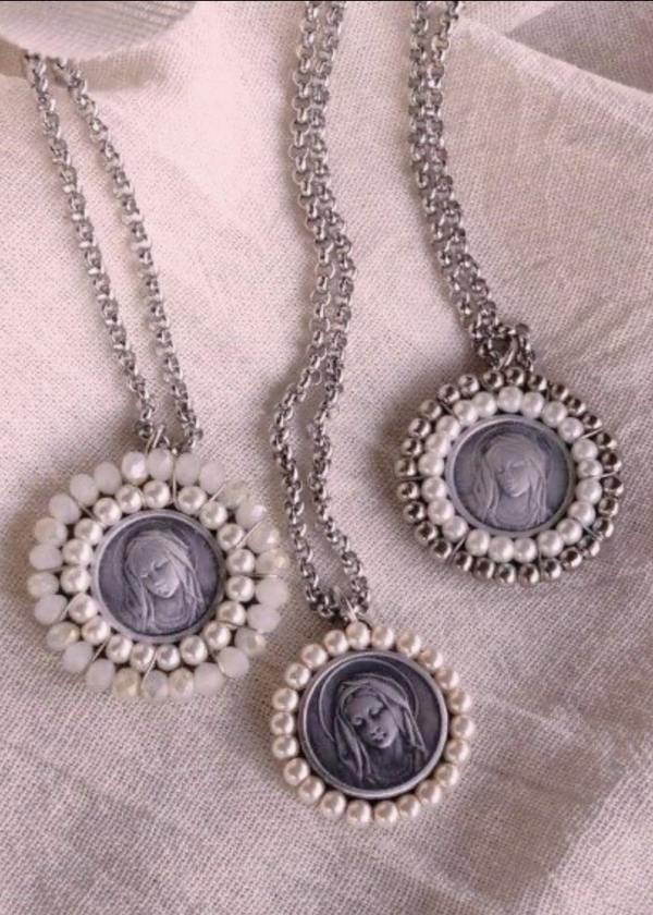 Medalla de aluminio, cosida con perlas de río y vidrios checos. Viene con la cadena de acero quirúrgico incluída.