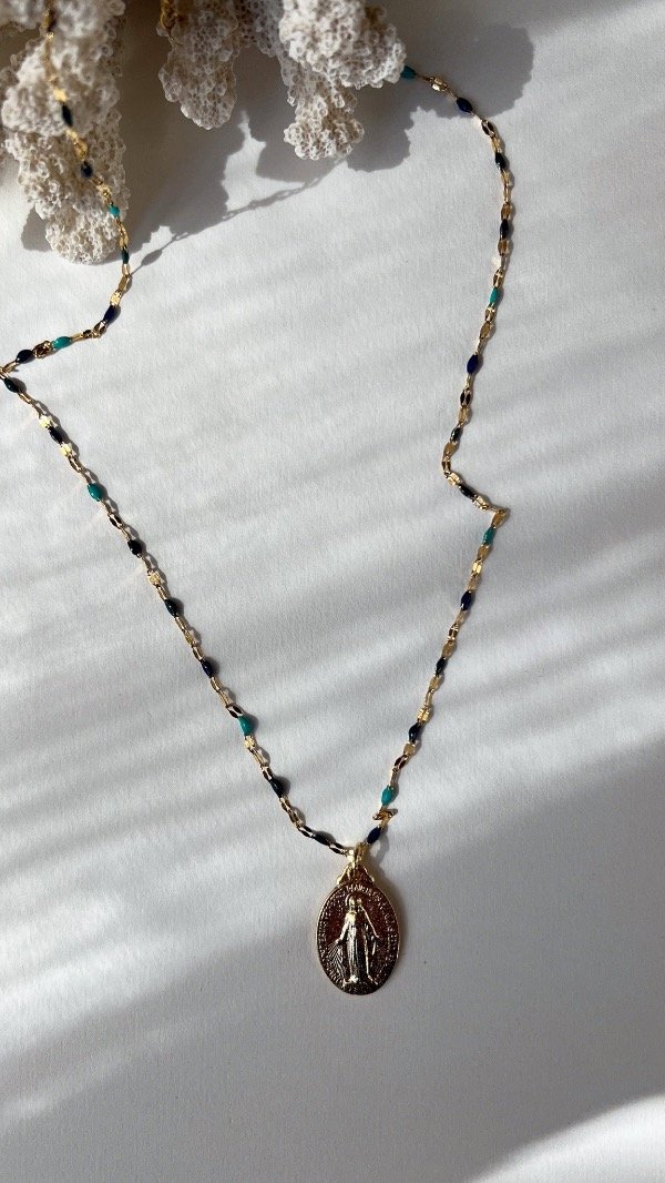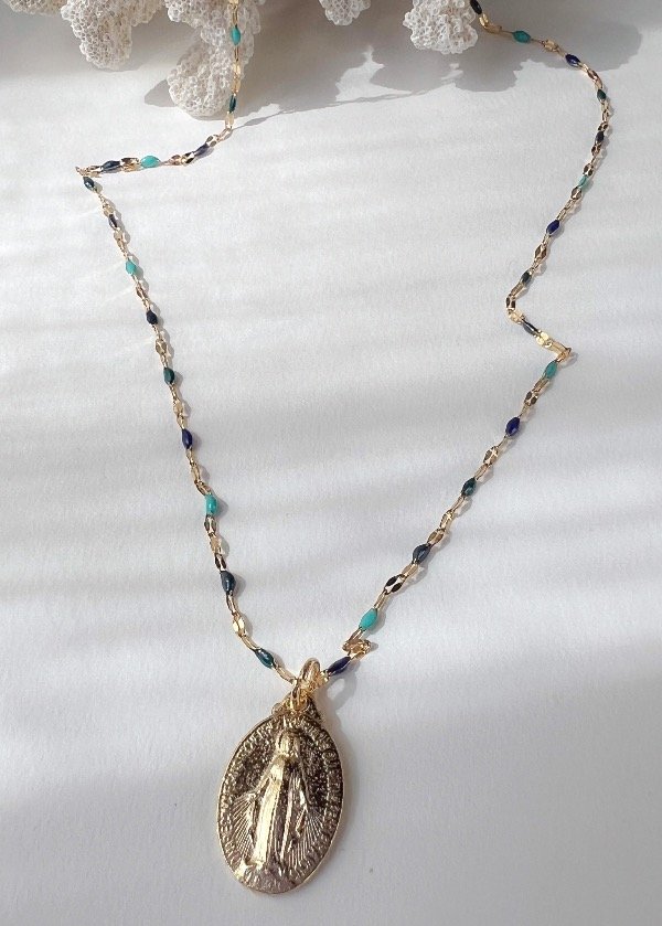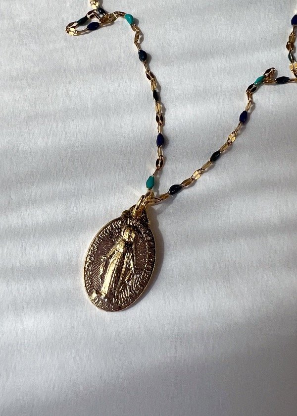 Cadena con pintas y medalla Milagrosa en el centro, todo bañado en oro. La Cadena viene en blanco o negro.