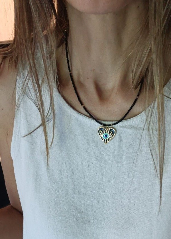 Collar de piedra onix pulida color negro + Dije Corazón. Viene con 10cm de alargue