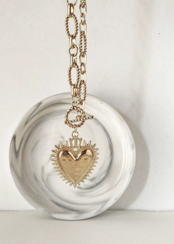 Collar de eslabones Grandes con cierre marinero y corazón de 4cm de largo. La cadena mide 44cm de largo. En la segunda foto el corazón esta sobre una mano para que se pueda dimensionar el tamaño.