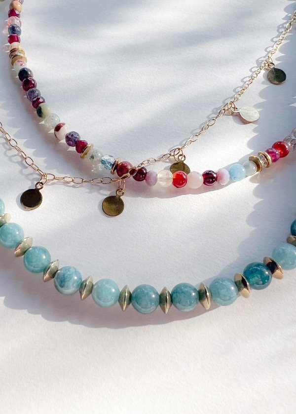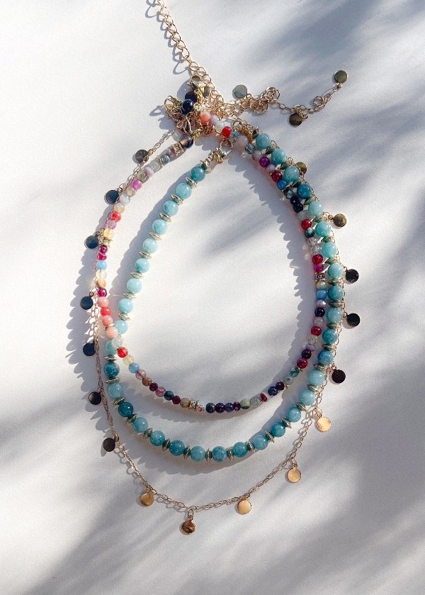 Incluye tres piezas: un collar Juana + una collar Lima aguamarina + una cadena Toledo. Las tres piezas se puede usar juntas o cada una por separado, no están atadas entre sí.