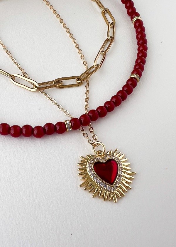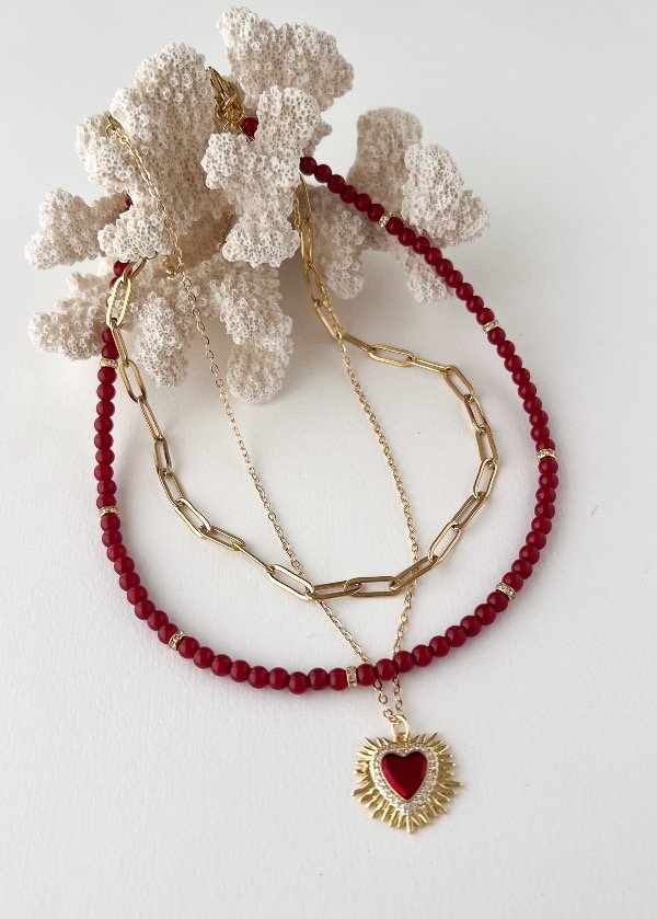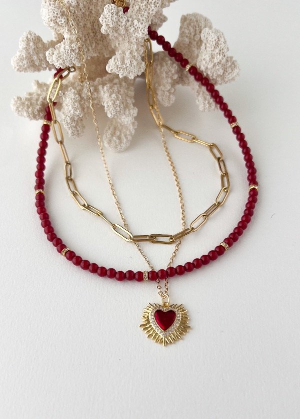 Incluye 3 piezas: un collar ágata ciruela + un dije vaquita de san Antonio bañado en oro + un collar forli (sol) bañado en oro
