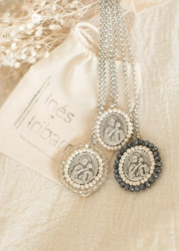Medalla de Aluminio, cosida con perlas de río y vidrios checos. Viene con la cadena de acero quirúrgico incluída.