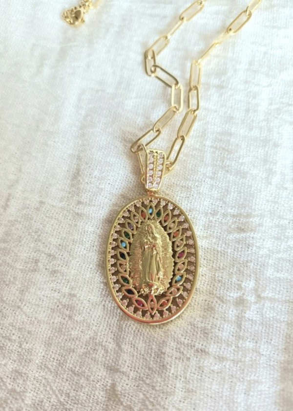 medalla de Guadalupe bañada en oro con mini strass de colores, viene con la cadena de 50cm. La medalla mide 3cm de largo