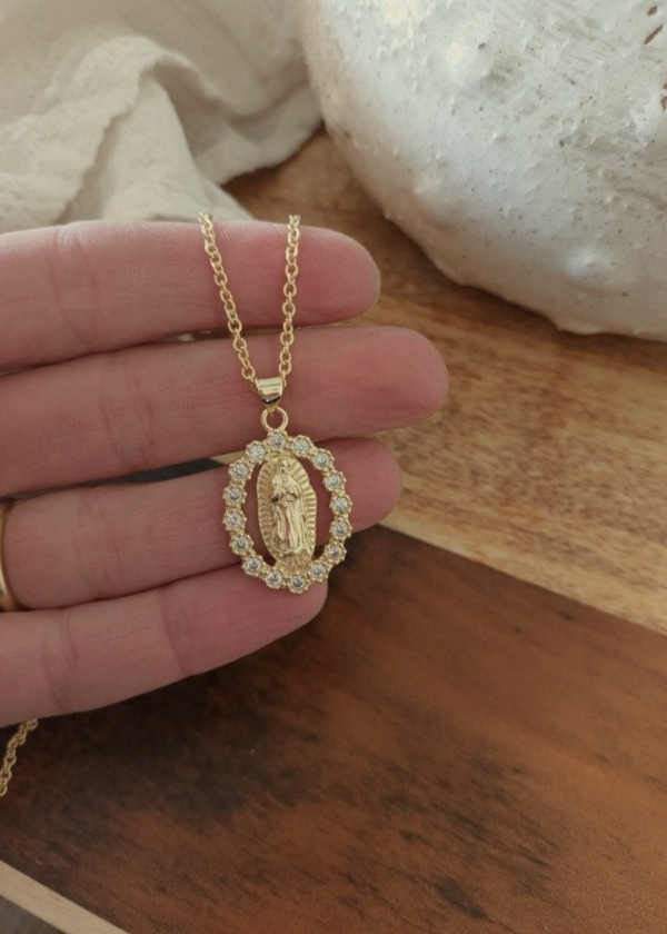 medalla de guadalupe bañada en oro con mini strass blancos, viene con la cadena de 50cm