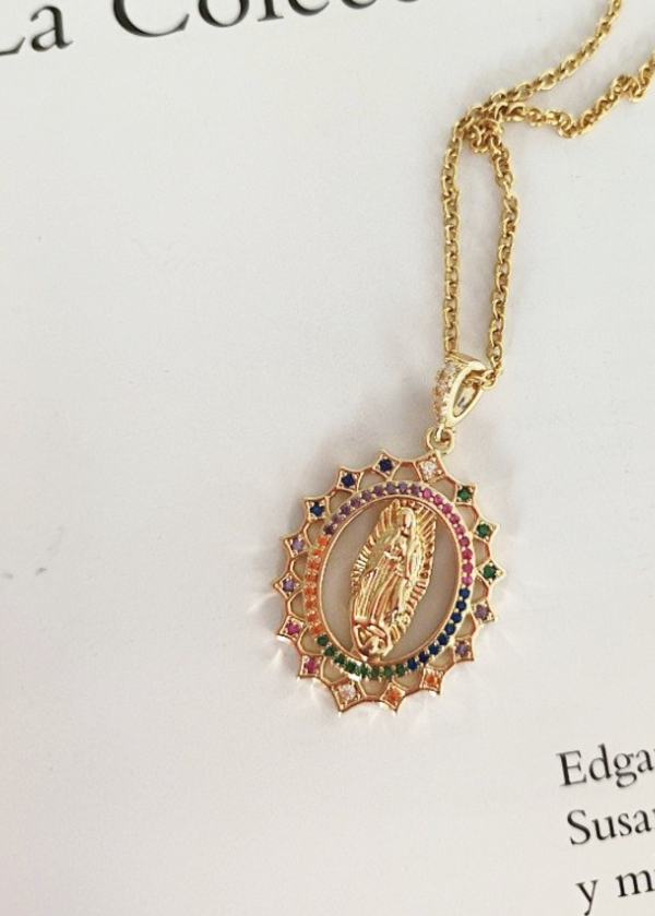 Cadena + Medalla de Guadalupe bañada en oro, con mini strass de colores. La Cadena mide 50cm