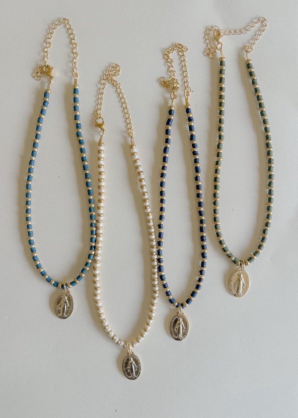 Collar de fimo negro y pepitas doradas en varios colores con medalla Milagrosa.