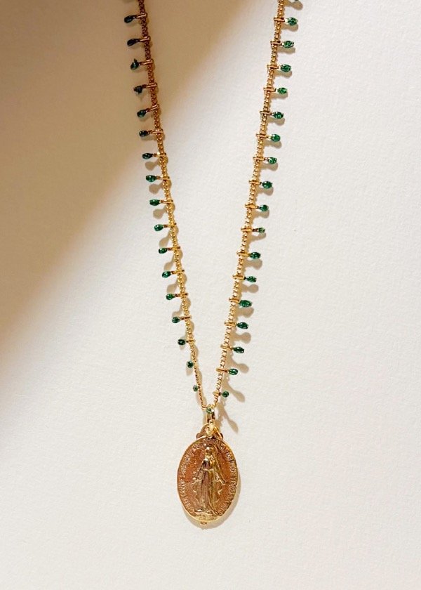 Medalla Milagrosa bañada en oro + cadena Trendy con piedritas multicolores intercaladas. La cadena mide 50 cm